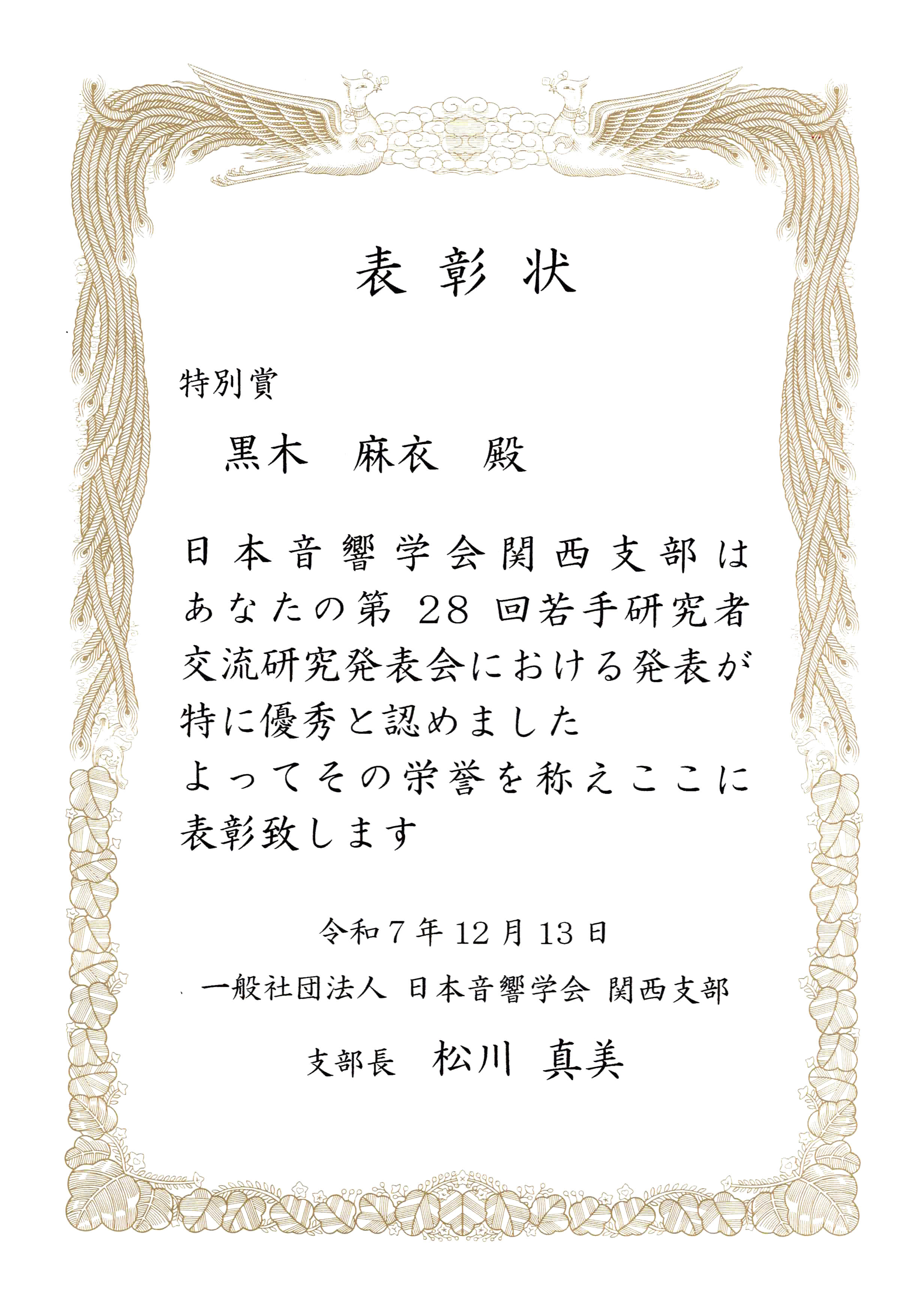 (「第28回 日本音響学会関西支部若手研究者交流研究発表会表彰に関するお知らせ」より引用)